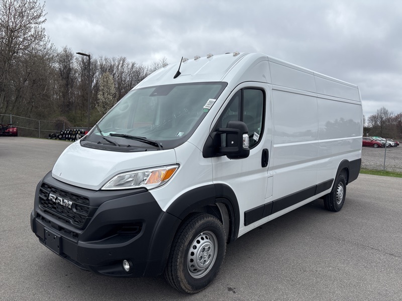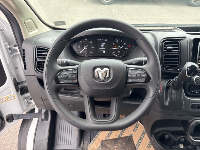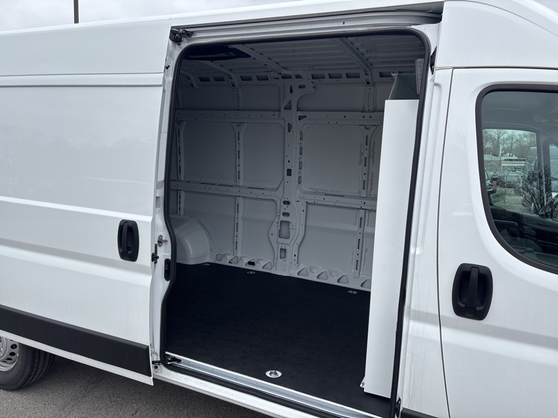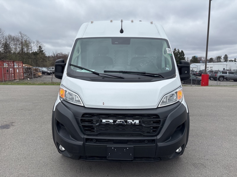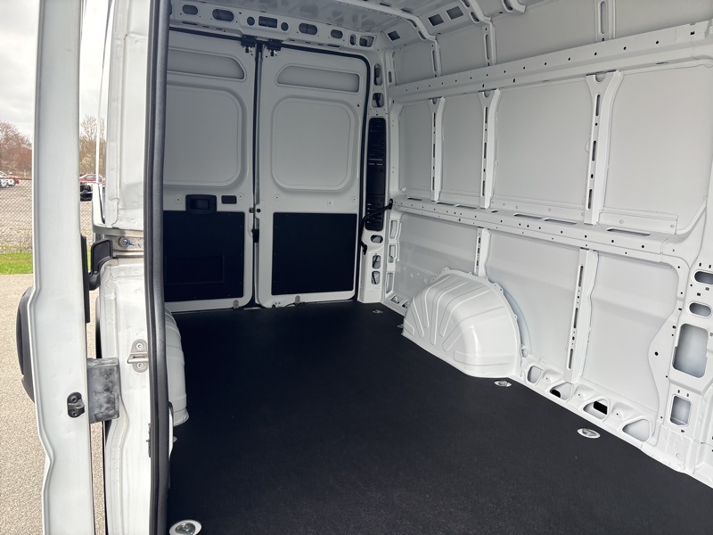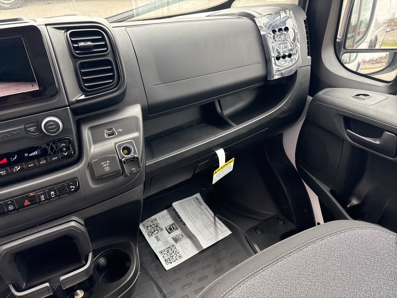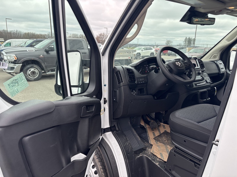 Convenience Group (Adaptive Cruise Control w/Stop & Go, Exterior Mirrors w/Heating Element, Exterior Mirrors w/Supplemental Signals, Front Fog Lamps, Power Adjust Mirrors, Power Folding/Heated Mirrors, Power-Adjustable Convex Aux Mirrors, Power-Folding Mirrors, and Rear Cargo LED Lamp), Power Group (100 Amp Battery, 115V Auxiliary Power Outlet, and 12V Rear Auxiliary Power Outlet), Quick Order Package 22B Tradesman w/Pass Seat (4-Way Manual Adjust Front Passenger Seat and Passenger Bucket Seat), Safety Group (Blind Spot & Cross Path Detection, Digital Rearview Mirror w/Autodim, Intelligent Speed Assist (ISA), Lane Departure Warning Plus, and ParkSense Front/Rear Park Assist System), Storage Group (Cargo Net, Shelf Above Roof Trim, and Underseat Storage Tray), Upfitter's Prep Package (Auxiliary Switches and Upfitter Electronic Module (VSIM)), 4 Speakers, 4-Wheel Disc Brakes, 4.08 Axle Ratio, ABS brakes, Air Conditioning, AM/FM radio: SiriusXM, Apple CarPlay/Android Auto, Black/Gray Seats, Bodyside moldings, Brake assist, Class IV Receiver Hitch, Cloth Bucket Seats, Driver door bin, Driver Seat Armrest, Driver's Seat Mounted Armrest, Electronic Stability Control, Front anti-roll bar, Front Bucket Seats, Front License Plate Bracket, Front reading lights, Front wheel independent suspension, Heavy Duty Suspension, Illuminated entry, Low tire pressure warning, Manufacturer's Statement of Origin, MOPAR Cargo Compartment Floor Mat, MOPAR Rear Assist Handles, Outside temperature display, Overhead airbag, Overhead console, ParkView Rear Back-Up Camera, Passenger door bin, Power steering, Power windows, Radio: Uconnect 5 w/7" Display, Rear anti-roll bar, Remote keyless entry, Steering wheel mounted audio controls, Tachometer, Telescoping steering wheel, Traction control, Trip computer, Turn signal indicator mirrors, Variably intermittent wipers, Wheel Center Cap, and Wheels: 16" x 6.0" Steel. Bright White Clearcoat 2024 Ram ProMaster 3500 High Roof FWD 9-Speed 948TE Automatic 3.6L V6 24V VVT