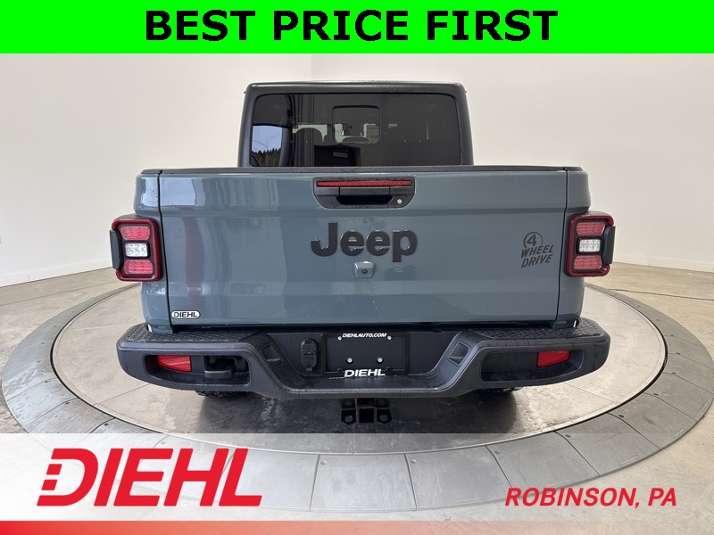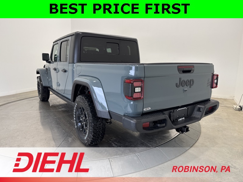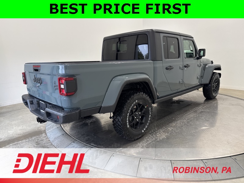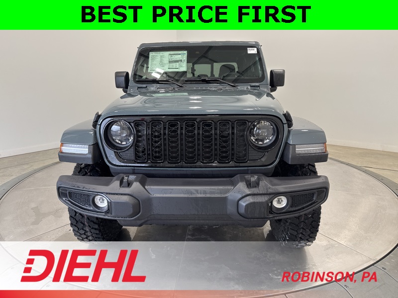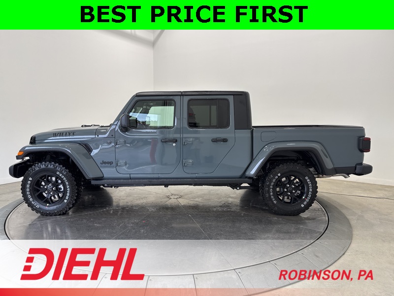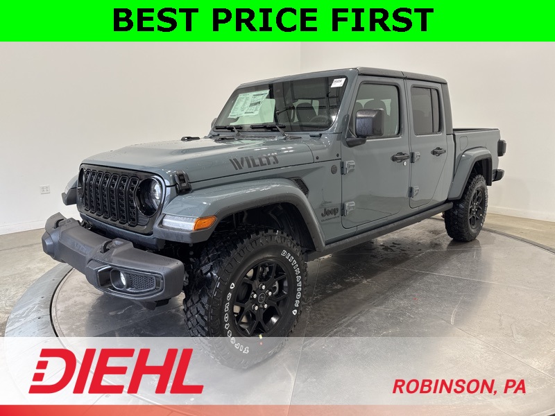 2025 Jeep Gladiator Willys 4x4 – Off-Road Package, Blackout Style, and Trail-Rated ToughThe 2025 Jeep Gladiator Willys 4x4 is where heritage meets hardcore off-road performance. Finished in rugged Anvil Clear-Coat with blackout badging and gloss-black accents, this pickup is a nod to Jeep’s legendary past with all the capability of today. Powered by the 3.6L Pentastar V6 paired with an 8-speed automatic, it’s engineered to deliver proven Jeep strength on-road and trail.Equipped with the Willys package, this Gladiator ups the ante with 32-inch mud-terrain tires, Trac-Lok limited-slip rear differential, heavy-duty Dana 44 axles, off-road tuned suspension, and rock rails for serious trail protection. The package also adds body-color fender flares, LED headlights and fog lamps, all-weather floor mats, and key blackout styling touches that make this truck look as mean as it performs.Inside, the Uconnect 5 system with a 12.3-inch touchscreen, Apple CarPlay, Android Auto, and premium audio keep you connected and entertained no matter how far off the beaten path you go. The Mopar spray-in bedliner, three-piece Freedom Top hard top, and auxiliary switches mean this Jeep is ready for custom gear, trail lights, or overlanding setups straight from the showroom.Safety and convenience features like ParkView backup camera, remote keyless entry, push-button start, and Hill-Start Assist make this Willys as practical as it is adventurous.If you’re looking for a pickup that’s equally at home crawling rocky trails as it is cruising Main Street, the 2025 Gladiator Willys 4x4 delivers in spades.Schedule your test drive today at Diehl of Robinson and get behind the wheel of a Gladiator that lives up to Jeep’s legendary off-road reputation. Price includes: $2250 - 2025 National Bonus Cash . Exp. 11/03/2025