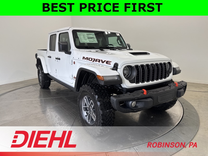 2025 Jeep Gladiator Mojave X 4x4 – Desert-Rated Pickup with FOX Shocks & Premium TechBuilt to dominate the toughest terrain, this 2025 Jeep Gladiator Mojave X 4x4 is not your average pickup—it’s Jeep’s first-ever Desert-Rated truck. Finished in Bright White Clear-Coat with a Black interior, this Mojave X pairs rugged strength with premium refinement. Under the hood sits the 3.6L Pentastar V6 with stop/start, teamed up with an 8-speed automatic and heavy-duty Dana 44 axles, making it as confident on city streets as it is carving through sand dunes.The Mojave X stands apart with FOX 2.5-inch internal bypass shocks, front hydraulic jounce bumpers, a reinforced frame, and a 1-inch lift for desert-running stability. Add in 33-inch mud-terrain tires, skid plates, and Off-Road+ Mode, and this Gladiator laughs at trails that would stop lesser trucks cold.Inside, premium touches bring comfort to the chaos. Leather-trimmed bucket seats with sport bolsters, a leather-wrapped dash, and Uconnect 5 with a massive 12.3-inch touchscreen put you in command. Navigation, premium Alpine audio, Apple CarPlay, Android Auto, and voice-activated controls keep you connected while your truck is kicking up dust.Convenience and safety aren’t overlooked. You’ll find adaptive cruise control, ParkSense rear park assist, forward collision warning, a forward-facing off-road camera, remote start, and dual-zone automatic climate control—because even desert warriors deserve comfort.From high-speed sand runs to hauling toys for the weekend, the Gladiator Mojave X 4x4 blends Jeep toughness with features that feel downright luxurious.Schedule your test drive today at Diehl of Robinson and see why the Mojave X isn’t just a truck—it’s an adrenaline-fueled lifestyle. Price includes: $5500 - 2025 National Bonus Cash . Exp. 11/03/2025