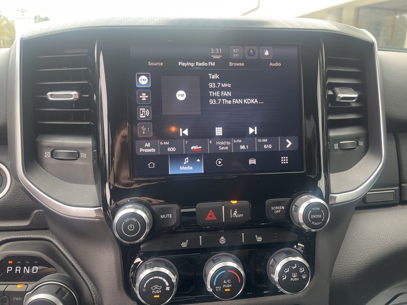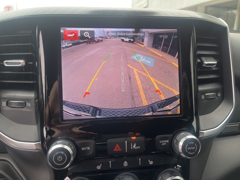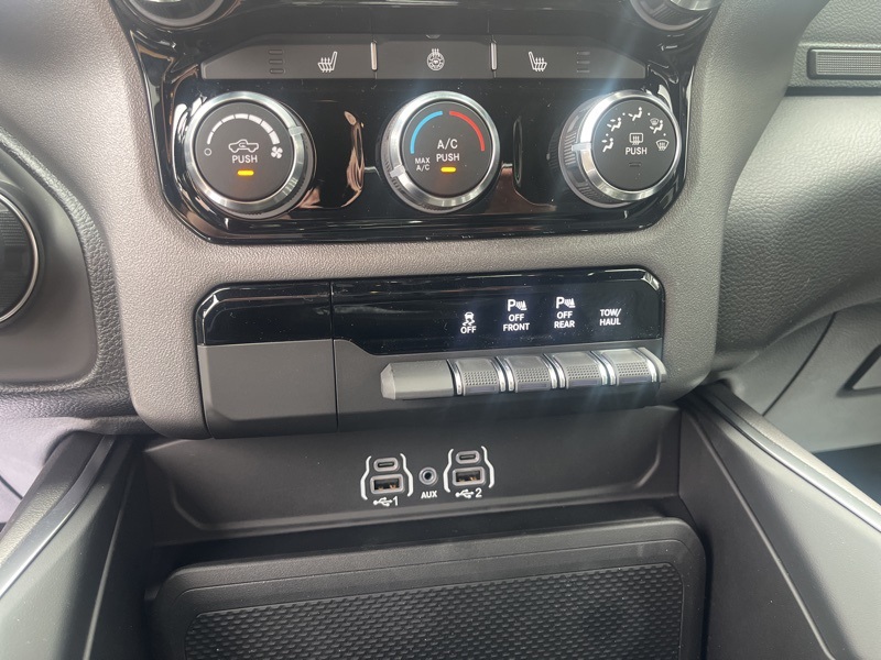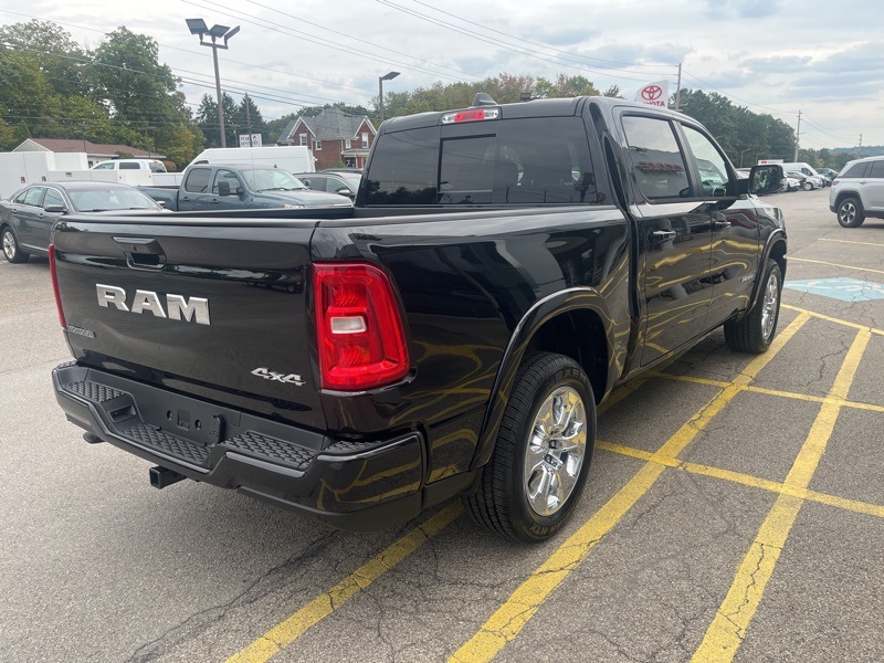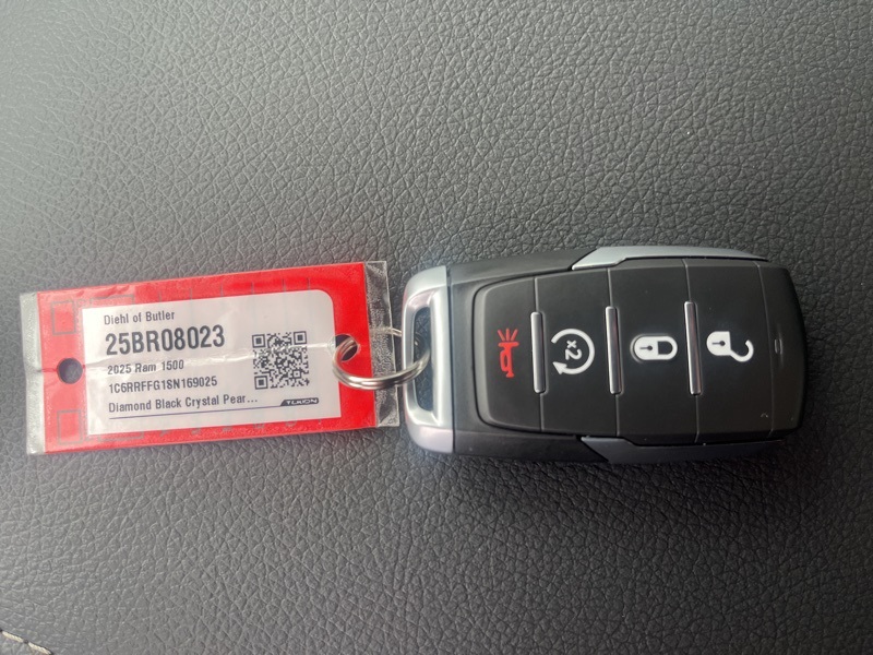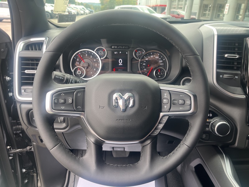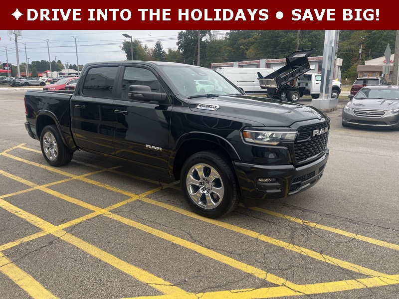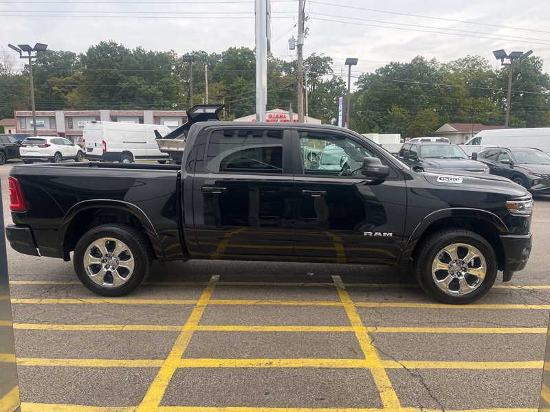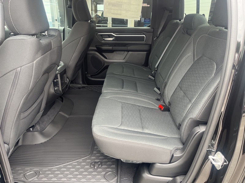 Bed Utility Group (Exterior 115V AC Outlet, MOPAR 4 Adjustable Cargo Tie-Down Hooks, MOPAR Spray In Bedliner, and Pick-Up Box Lighting), Big Horn Level 1 Equipment Group (115V Auxiliary Power Outlet, 2nd Row In Floor Storage Bins, 400W Inverter, Auto Power-Folding Mirrors, Auto-Dimming Exterior Driver Mirror, Auto-Dimming Rear-View Mirror, Black Exterior Mirrors, Black Premium Power Mirrors, Convex Wide-Angle Exterior Mirror Insert, Exterior Mirrors Courtesy Lamps, Exterior Mirrors w/Heating Element, Exterior Mirrors w/Supplemental Signals, Glove Box Lamp, Heated Front Seats, Heated Steering Wheel, Leather Wrapped Steering Wheel, Power 2-Way Driver Lumbar Adjust, Power Adjust 8-Way Driver Seat, Power Adjustable Pedals, Rear Power Sliding Window, Rear Window Defroster, Steering Wheel Mounted Audio Controls, Sun Visors w/Illuminated Vanity Mirrors, and Universal Garage Door Opener), Quick Order Package 23Z Big Horn (Big Horn Badge), Sport Appearance Package (3 Rear Seat Head Restraints, 4 Way Front Headrests, Black Interior Accents, Body Color Door Handles, Body Color Front Bumper, Body Color Rear Bumper w/Step Pads, Body Color Tailgate Handle, Bucket Seats, Deluxe Cloth Bucket Seats, Front Seat Back Map Pockets, Full Length Floor Console, Grille Surround 1 Body Color Texture 1 Black, Manual Adjust 4-Way Front Passenger Seat, RAM Grille Badge - Chrome, Rear 60/40 Folding Seat, and Rear Center Armrest), 4-Wheel Disc Brakes, 4G LTE Wi-Fi Hot Spot, 6 Speakers, ABS brakes, Air Conditioning, Alloy wheels, AM/FM radio, Apple CarPlay/Android Auto, Auto High-beam Headlights, Brake assist, Bumpers: chrome, Cloth Bench Seat, Compass, Connectivity - US/Canada, Delay-off headlights, Driver door bin, Dual front impact airbags, Dual front side impact airbags, Electronic Stability Control, Front anti-roll bar, Front Center Armrest w/Storage, Front fog lights, Front reading lights, Front wheel independent suspension, Fully automatic headlights, GPS Antenna Input, Heated door mirrors, Illuminated entry, Integrated Voice Command w/Bluetooth, Low tire pressure warning, Manual Folding Exterior Mirrors, MOPAR Front & Rear Rubber Floor Mats, Occupant sensing airbag, Outside temperature display, Overhead airbag, Overhead console, Panic alarm, ParkView Rear Back-Up Camera, Passenger door bin, Passenger vanity mirror, Power door mirrors, Power steering, Power windows, Radio data system, Radio: Uconnect 5 W w/8.4" Display, Rear anti-roll bar, Rear seat center armrest, Rear step bumper, Remote keyless entry, Speed control, Split folding rear seat, Supplier Part Tracking (J-1), Tachometer, Telescoping steering wheel, Tilt steering wheel, Traction control, Trip computer, USB Host Flip, Variably intermittent wipers, Voltmeter, Wheels: 18" x 8" Cast-Aluminum Painted, and Wheels: 20" x 9" Aluminum Chrome Clad (WRD) Diamond Black Crystal Pearlcoat 2025 Ram 1500 Big Horn/Lone Star 4WD 8-Speed Automatic 3.6L V6 24V VVT
