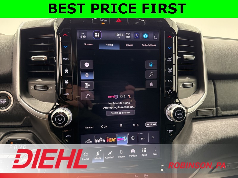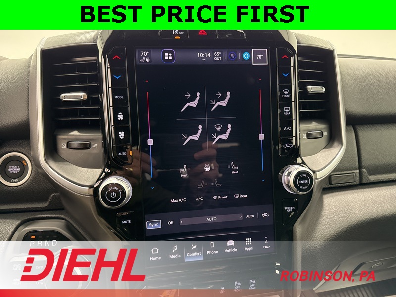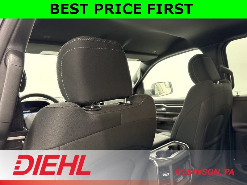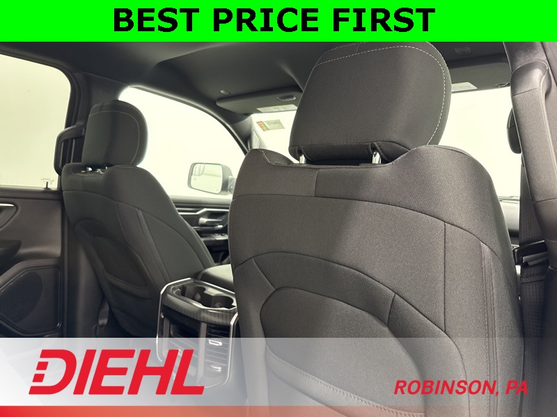 Inside, the Crew Cab offers first-class space with premium cloth seats, a massive 12-inch Uconnect touchscreen, Apple CarPlay, Android Auto, and integrated navigation. Heated front seats, a heated steering wheel, and dual-zone climate control turn even cold Pittsburgh mornings into comfort zones.
