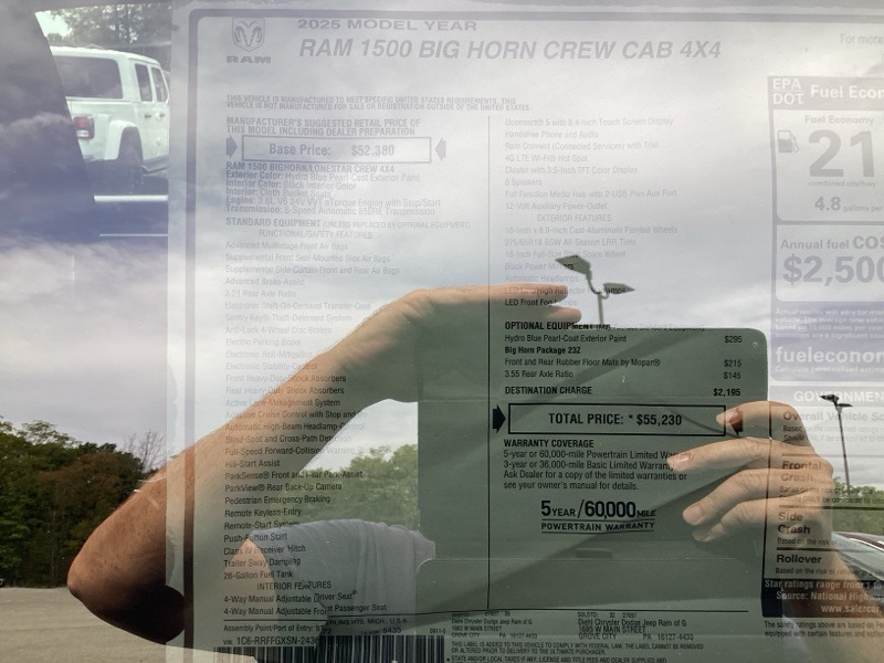 Hydro Blue Pearlcoat 2025 1500 Ram Big Horn/Lone Star 4D Crew Cab 4WD 8-Speed Automatic 3.6L V6 24V VVT Price includes: $2000 - 2025 National SFS Lease Loyalty Bonus Cash. Exp. 11/03/2025 10% Msrp - 2025 National 10% Below MSRP . Exp. 11/03/2025