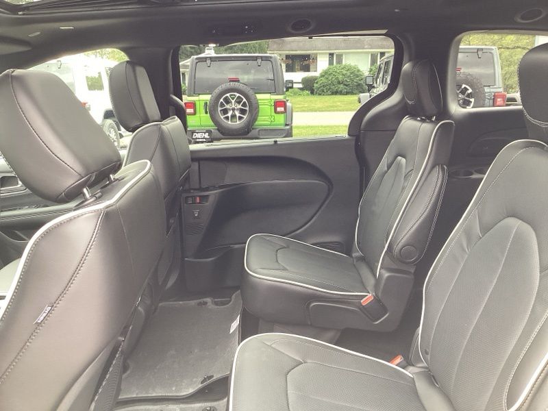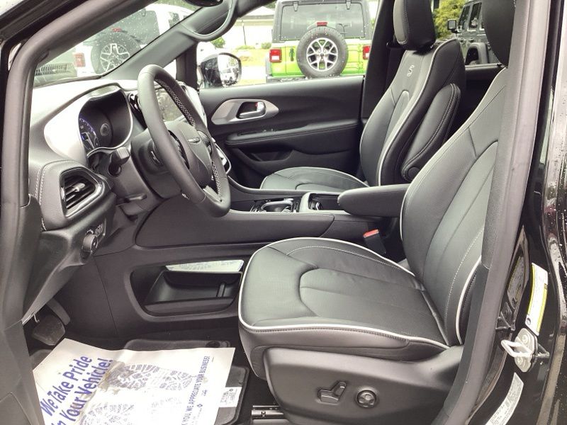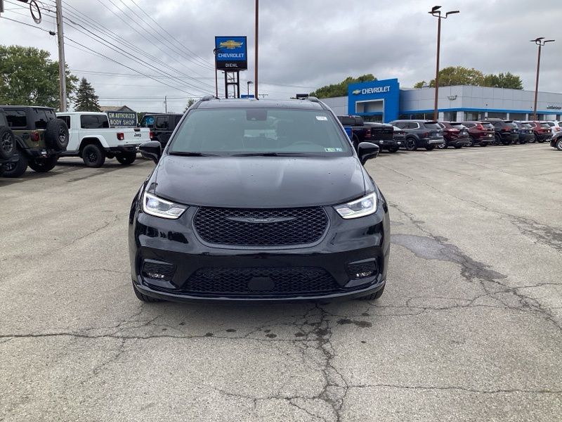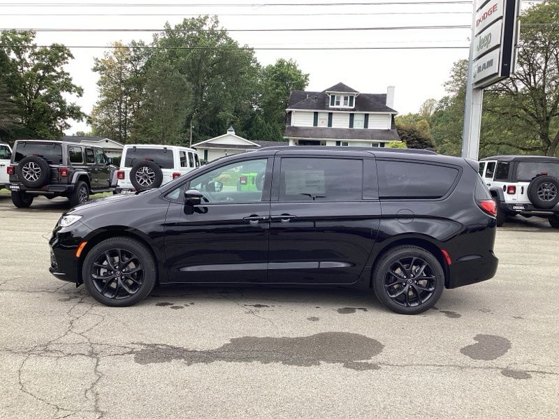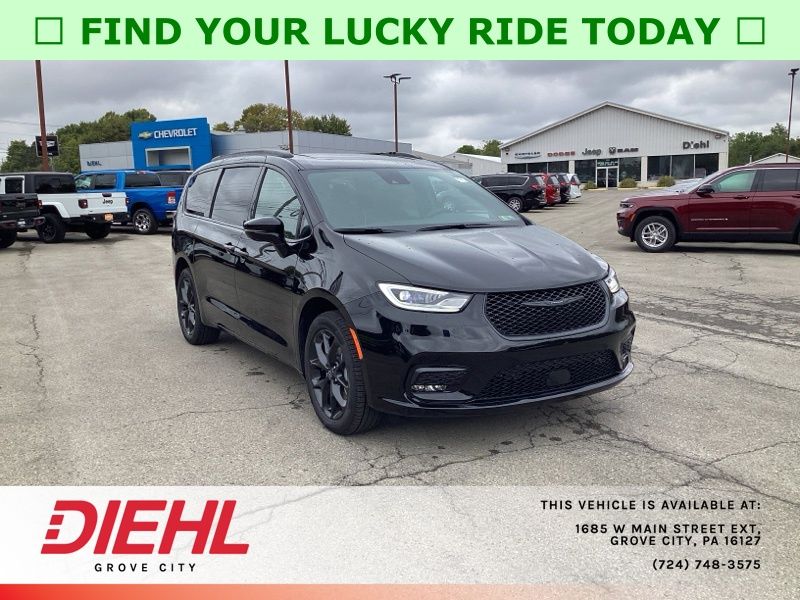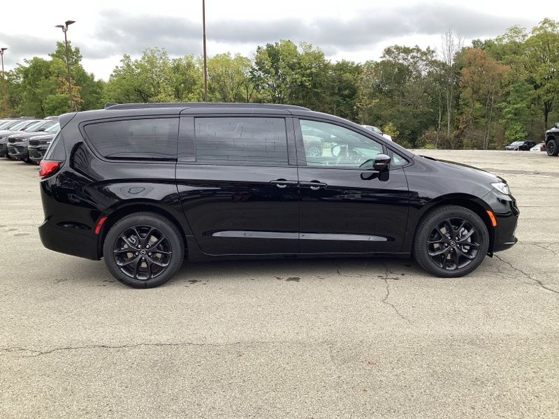 The S Appearance Package gives this Pacifica a sporty, upscale look with anodized ink badging, gloss black exterior mirrors, black day light opening moldings, a premium fascia with a black surround grille, and a premium rear fascia with black accents. A black Stow N Place roof rack adds extra versatility while bold 20" S-model aluminum wheels complete the aggressive styling.