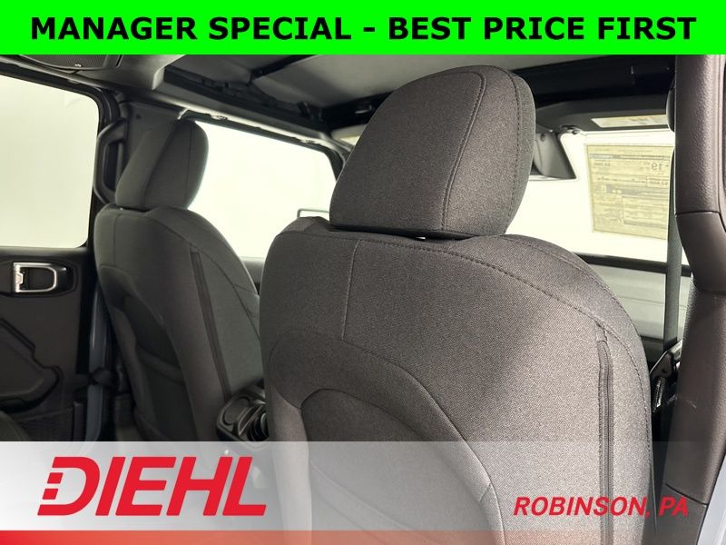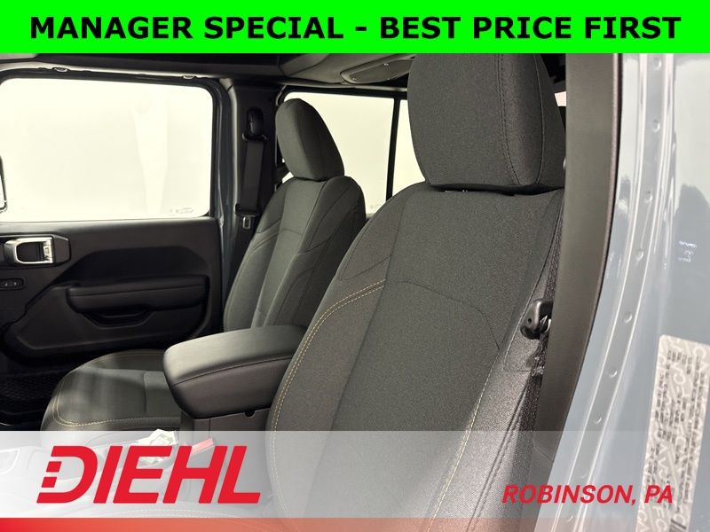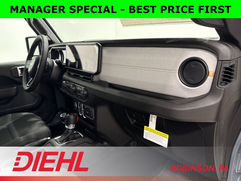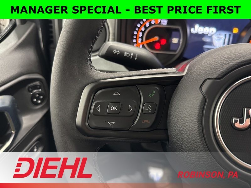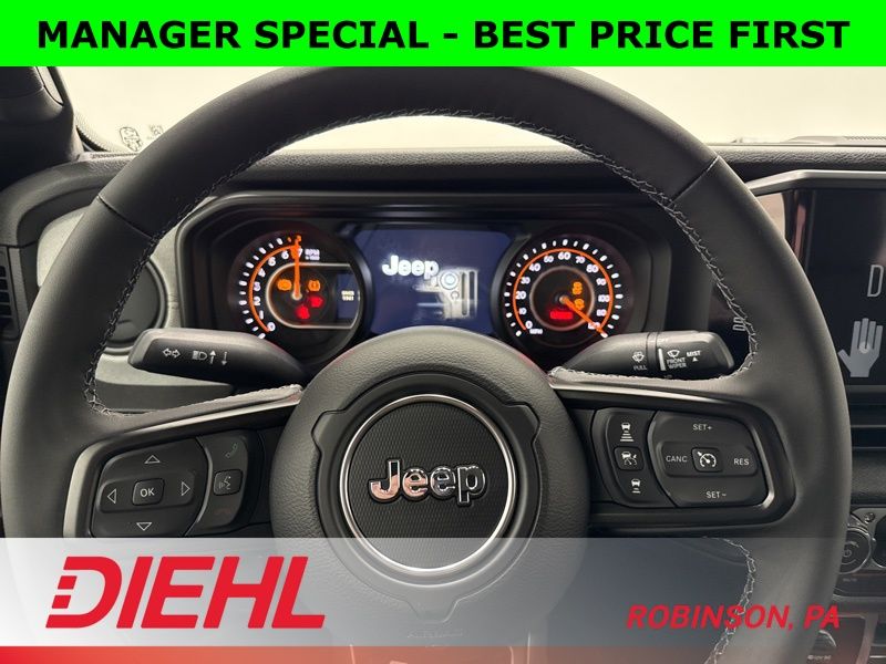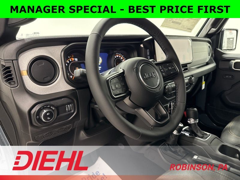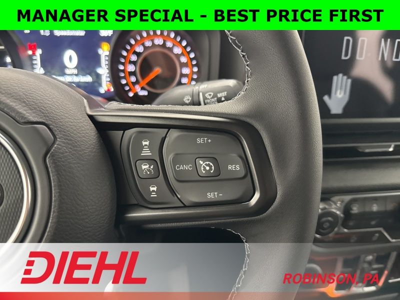 Inside, you’ll find the perfect balance between rugged and refined. The black cloth interior features the latest 12.3-inch Uconnect 5 touchscreen, Apple CarPlay and Android Auto integration, and voice-activated navigation that actually listens. Dual-zone automatic climate control, power windows and locks, and a wrapped steering wheel bring modern comfort to this trail legend.