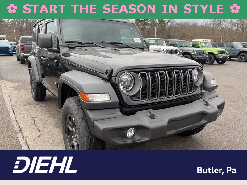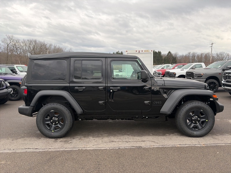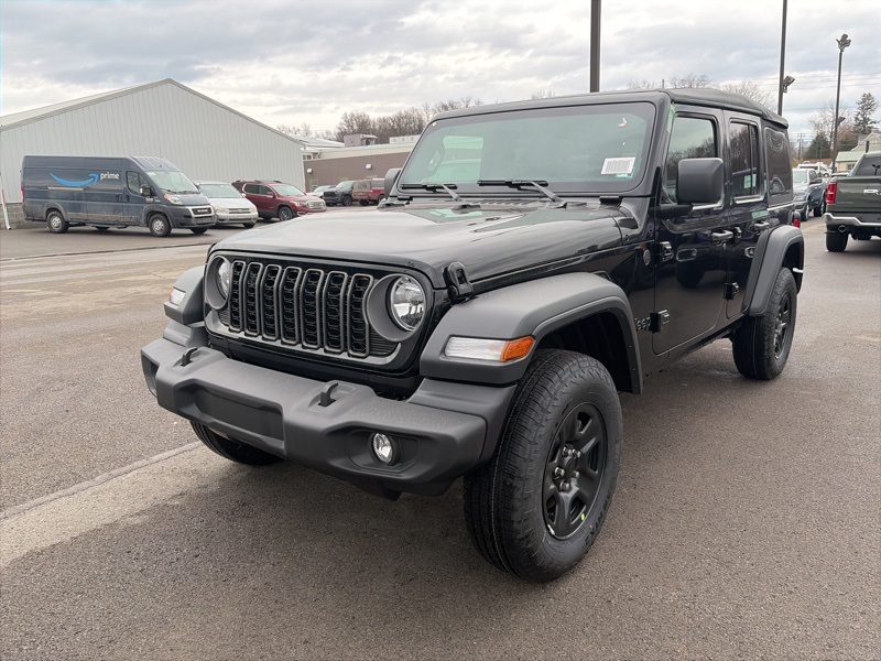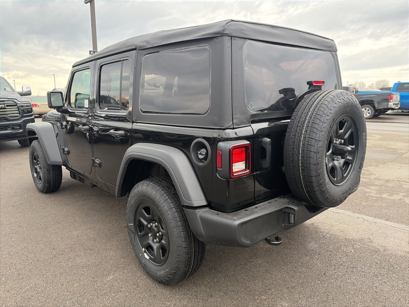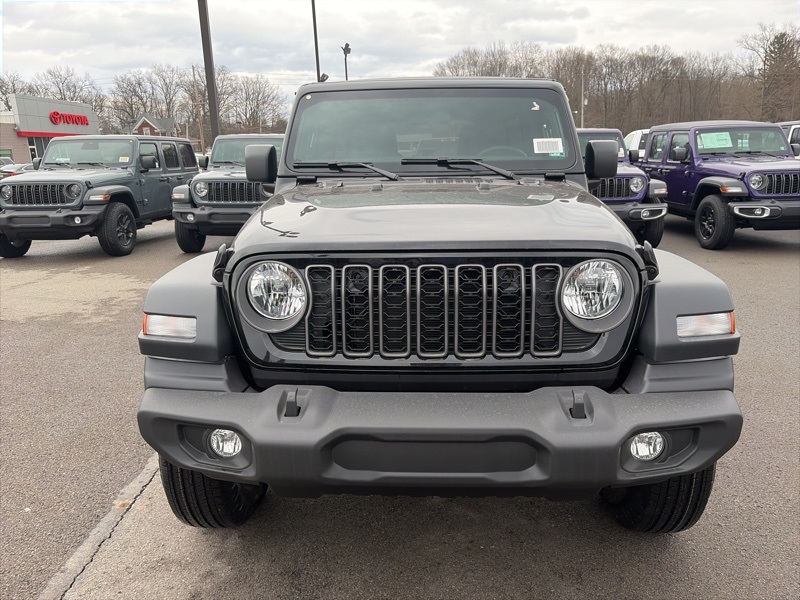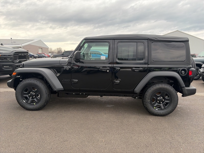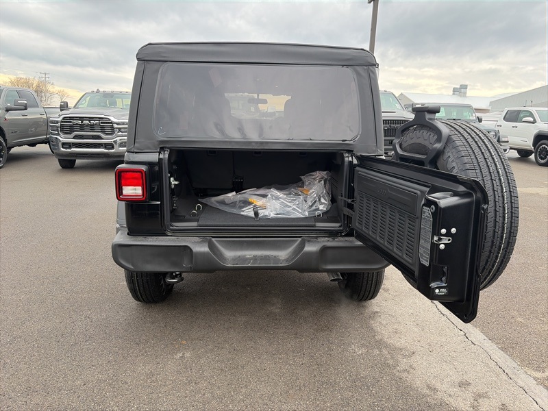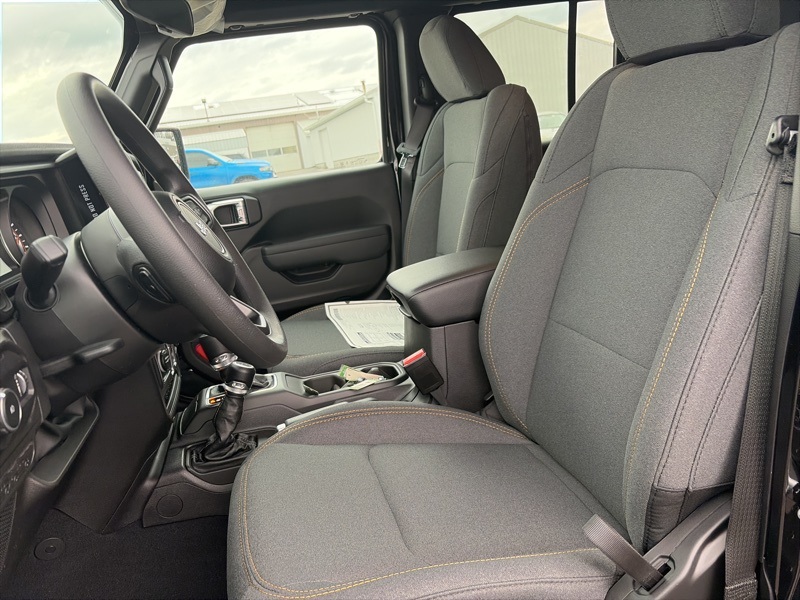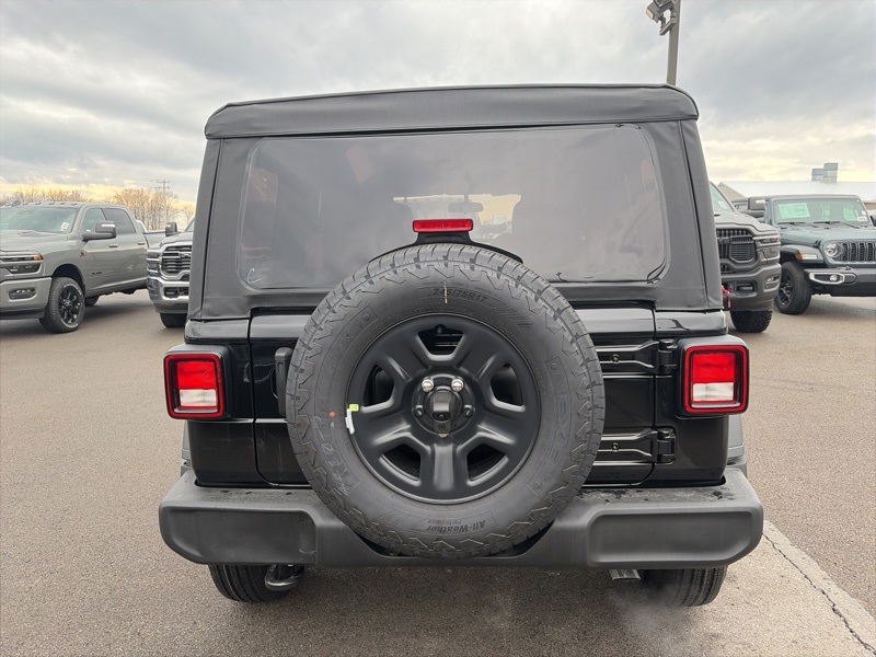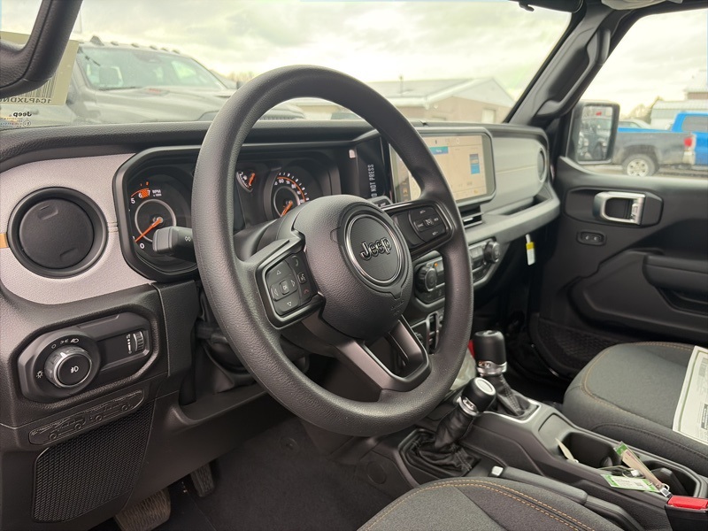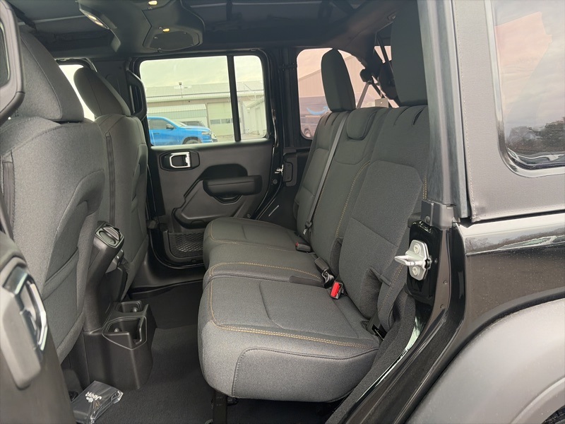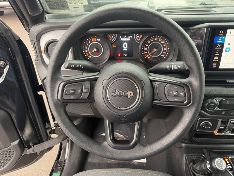 Quick Order Package 22B Sport, 12.3" Touchscreen Display, 3.45 Overall Top Gear Ratio, 4-Wheel Disc Brakes, 4G LTE Wi-Fi Hot Spot, 8 Speakers, ABS brakes, Air Conditioning, AM/FM radio: SiriusXM with 360L, Apple CarPlay, Apple CarPlay/Android Auto, Aux Battery, Brake assist, Compass, Connectivity - US/Canada, Deep Tint Sunscreen Windows, Delay-off headlights, Driver door bin, Driver vanity mirror, Dual front impact airbags, Dual front side impact airbags, Electronic Stability Control, For More Info, Call 800-643-2112, Front anti-roll bar, Front Bucket Seats, Front Center Armrest w/Storage, Front fog lights, Front reading lights, Google Android Auto, Illuminated entry, Integrated Center Stack Radio, Integrated roll-over protection, Low tire pressure warning, MOPAR All-Weather Floor Mats, Non-Lock Fuel Cap Without Discriminator, Normal Duty Suspension, Occupant sensing airbag, Outside temperature display, Overhead airbag, Panic alarm, ParkView Rear Back-Up Camera, Passenger door bin, Passenger vanity mirror, Power steering, Power windows, Radio data system, Radio: Uconnect 5 with 12.3" Display, Rear anti-roll bar, Rear reading lights, Remote keyless entry, SiriusXM Radio Service, SiriusXM with 360L, Speed control, Split folding rear seat, Steering wheel mounted audio controls, Stop-Start Dual Battery System, Tachometer, Telescoping steering wheel, Tilt steering wheel, Traction control, Trip computer, Variably intermittent wipers, and Wheels: 17" x 7.5" Black Steel Styled. black clearcoat 2026 Jeep Wrangler Sport 4WD 8-Speed Automatic 2.0L I4 DOHC