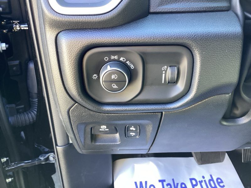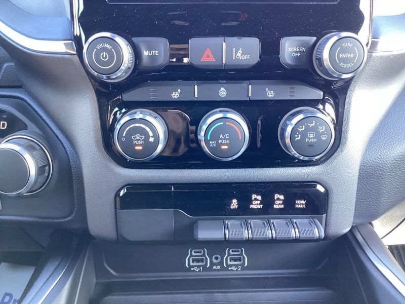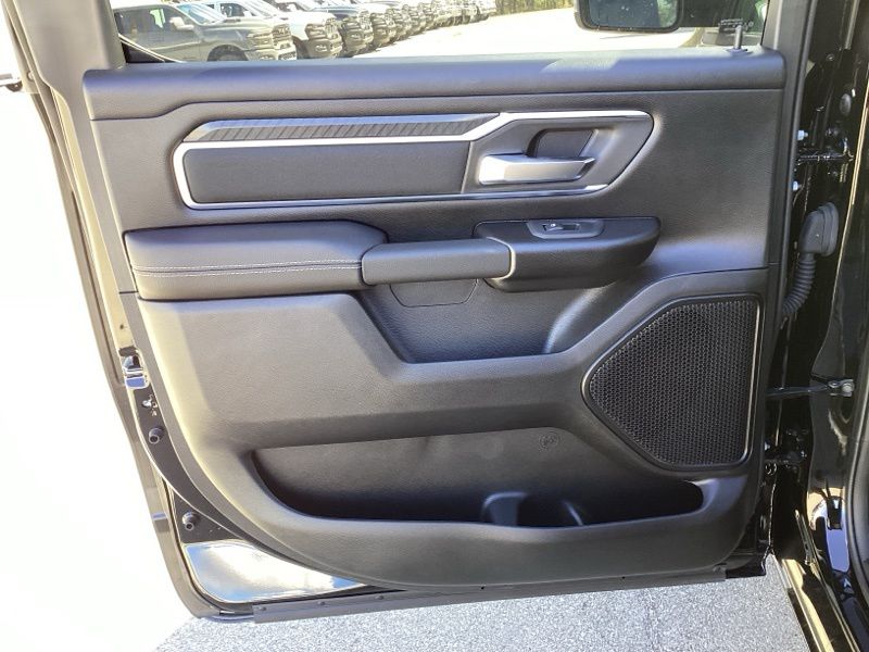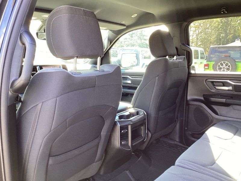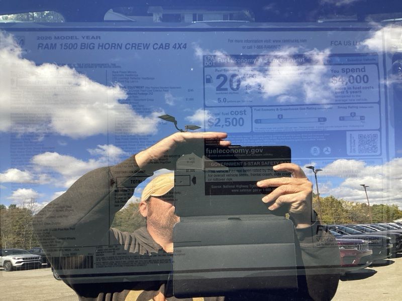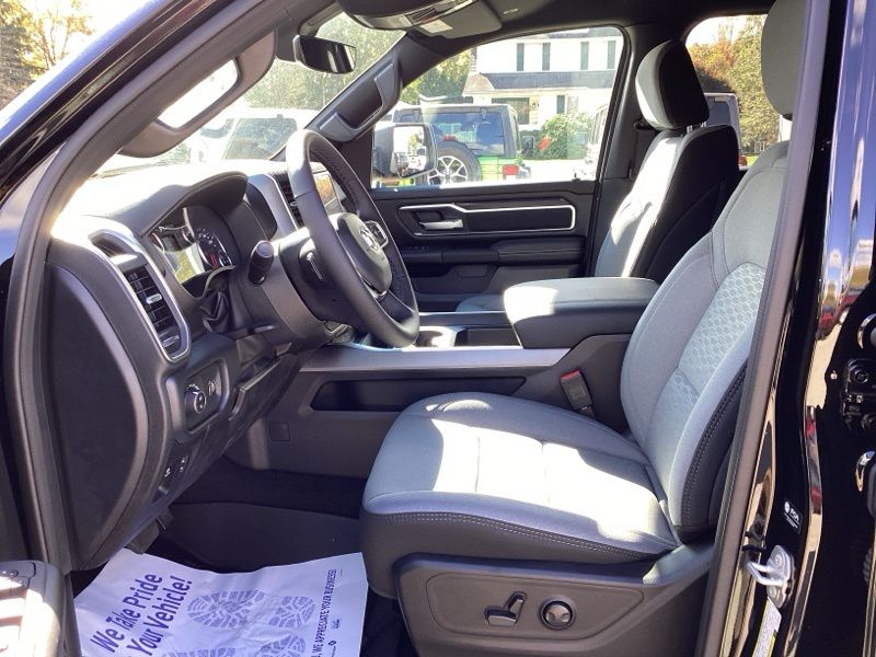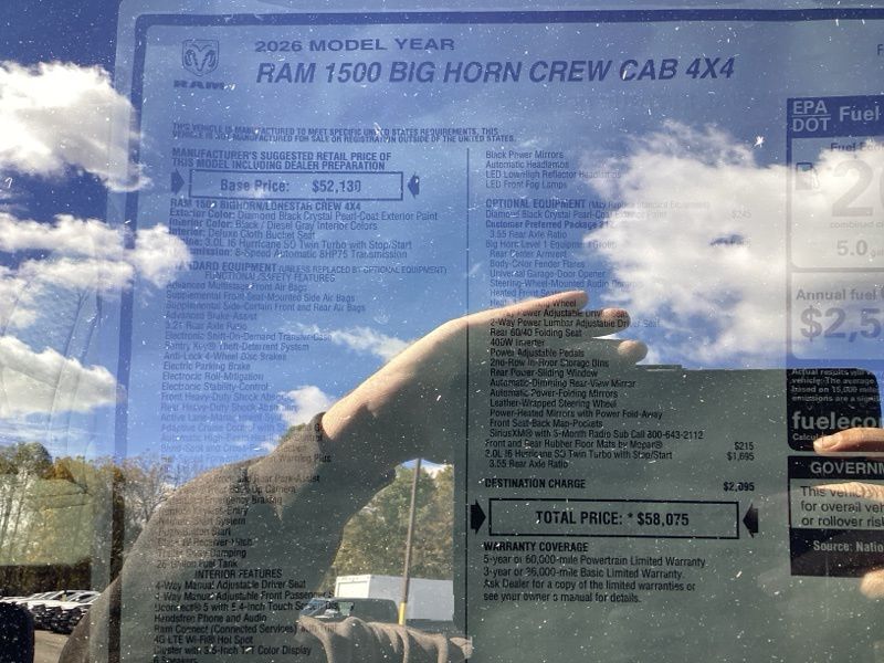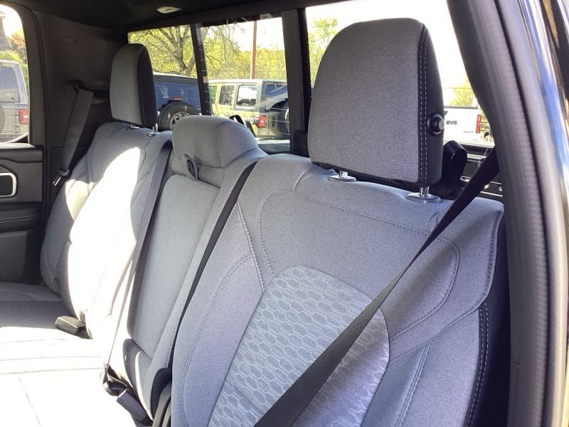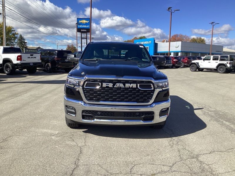 2026 Ram 1500 Big Horn/Lone Star 4WD finished in Diamond Black Crystal Pearlcoat with an 8-speed automatic transmission and 3.0L I6 engine. Equipped with Quick Order Package 21Z Big Horn and Big Horn Level 1 Equipment Group. Features include heated front seats, heated steering wheel, leather wrapped steering wheel, power adjustable pedals, power adjustable driver seat with lumbar support, deluxe cloth bucket seats, full length floor console, rear 60/40 folding seat with center armrest, rear power sliding window, rear window defroster, second row in floor storage bins, and MOPAR front and rear rubber floor mats. Technology includes Uconnect 5 with 8.4 inch display, Apple CarPlay, Android Auto, SiriusXM radio service, 4G LTE Wi-Fi hot spot, integrated voice command with Bluetooth, steering wheel mounted audio controls, and universal garage door opener. Safety and convenience features include ParkView rear back-up camera, electronic stability control, traction control, brake assist, auto high-beam headlights, fully automatic headlights, remote keyless entry, speed control, and chrome bumpers. Finished with rear wheelhouse liners and 18 inch cast-aluminum painted wheels.