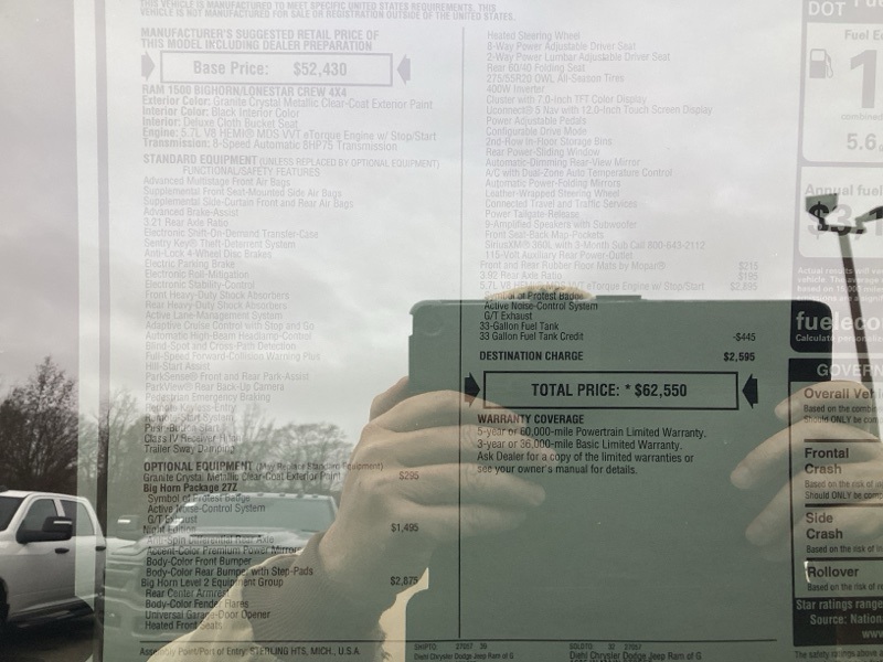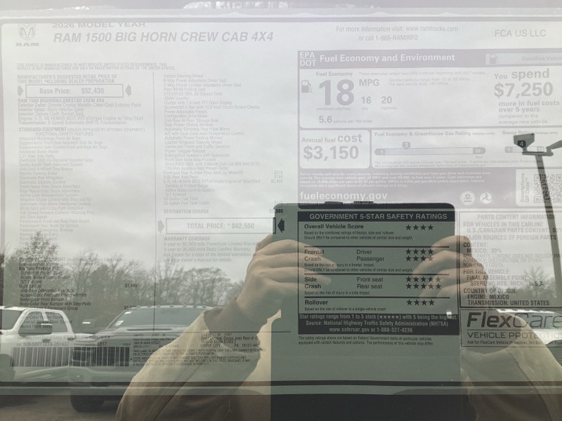 Granite Crystal Metallic Clearcoat 2026 1500 Ram Big Horn/Lone Star 4D Crew Cab 4WD 8-Speed Automatic HEMI 5.7L V8 Multi Displacement VVT eTorque Price includes: $2000 - 2026 National SFS Lease Loyalty Bonus Cash . Exp. 01/05/2026 $3500 - 2026 National Retail Consumer Cash . Exp. 01/05/2026