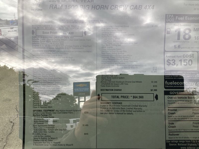 Granite Crystal Metallic Clearcoat 2026 1500 Ram Big Horn/Lone Star 4D Crew Cab 4WD 8-Speed Automatic HEMI 5.7L V8 Multi Displacement VVT eTorque Price includes: $2000 - 2026 National SFS Lease Loyalty Bonus Cash . Exp. 03/31/2026 $3500 - 2026 National Retail Bonus Cash . Exp. 03/31/2026 $500 - 2026 National 2026 First Responder Bonus Cash . Exp. 01/04/2027