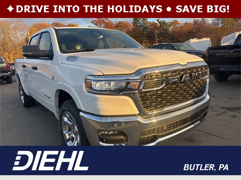 Bed Utility Group (Exterior 115V AC Outlet, MOPAR 4 Adjustable Cargo Tie-Down Hooks, MOPAR Spray In Bedliner, and Pick-Up Box Lighting), Big Horn Level 2 Equipment Group (115V Auxiliary Power Outlet, 115V Auxiliary Rear Power Outlet, 12" Touchscreen Display, 2nd Row In Floor Storage Bins, 3 Rear Seat Head Restraints, 4 Way Front Headrests, 400W Inverter, 4G LTE Wi-Fi Hot Spot, 9 Amplified Speakers w/Subwoofer, Air Conditioning ATC w/Dual Zone Control, Apple CarPlay, Auto Power-Folding Mirrors, Auto-Dimming Exterior Driver Mirror, Auto-Dimming Rear-View Mirror, Black Exterior Mirrors, Black Premium Power Mirrors, Body Color Fender Flares, Bucket Seats, Center Console Parts Module, Cluster 7.0" TFT Color Display, Configurable Drive Mode, Connected Travel & Traffic Services, Connectivity - US/Canada, Convex Wide-Angle Exterior Mirror Insert, Deluxe Cloth Bucket Seats, Disassociated Touchscreen Display, Exterior Mirrors Courtesy Lamps, Exterior Mirrors w/Heating Element, Exterior Mirrors w/Supplemental Signals, Front Seat Back Map Pockets, Full Length Floor Console, Global Telematics Box Module (TBM), Glove Box Lamp, Google Android Auto, GPS Antenna Input, GPS Navigation, HD Radio, Heated Front Seats, Heated Steering Wheel, Integrated Center Stack Radio, Integrated Voice Command w/Bluetooth, Leather Wrapped Steering Wheel, LED Dome Lamp w/On/Off Switch, LED Footwell Lighting, Manual Adjust 4-Way Front Passenger Seat, Media Hub w/2 Charge Only USBs, Overhead LED Lamps, Power 2-Way Driver Lumbar Adjust, Power Adjust 8-Way Driver Seat, Power Adjustable Pedals, Premium Overhead Console, Radio: Uconnect 5 Nav w/12.0" Display, Rear 60/40 Folding Seat, Rear Center Armrest, Rear Power Sliding Window, Rear Window Defroster, Remote Tailgate Release, Security Alarm, SiriusXM Radio Service, SiriusXM w/360L, Steering Wheel Mounted Audio Controls, Sun Visors w/Illuminated Vanity Mirrors, Universal Garage Door Opener, USB Host Flip, and Wheels: 20" x 9" Aluminum Chrome Clad (WRK)), Quick Order Package 27Z Big Horn, 33 Gallon Fuel Tank, 4-Wheel Disc Brakes, 48V Belt Starter Generator, 6 Speakers, ABS brakes, Air Conditioning, Alloy wheels, AM/FM radio, Apple CarPlay/Android Auto, Auto High-beam Headlights, Brake assist, Bumpers: chrome, Cloth Bucket Seats, Compass, Delay-off headlights, Driver door bin, Dual front impact airbags, Dual front side impact airbags, Electronic Stability Control, Front anti-roll bar, Front Bucket Seats, Front Center Armrest w/Storage, Front fog lights, Front reading lights, Front wheel independent suspension, Fully automatic headlights, Heated door mirrors, Illuminated entry, Low tire pressure warning, Manual Adjust 4-Way Driver Seat, Manual Folding Exterior Mirrors, MOPAR Front & Rear Rubber Floor Mats, Occupant sensing airbag, Outside temperature display, Overhead airbag, Overhead console, Panic alarm, ParkView Rear Back-Up Camera, Passenger door bin, Passenger vanity mirror, Power door mirrors, Power steering, Power windows, Radio data system, Radio: Uconnect 5 W w/8.4" Display, RAM Grille Badge - Chrome, Rear anti-roll bar, Rear step bumper, Remote keyless entry, Speed control, Supplier Part Tracking (J-1), Tachometer, Telescoping steering wheel, Tilt steering wheel, Traction control, Trailer Brake Control, Trip computer, Variably intermittent wipers, Voltmeter, and Wheels: 18" x 8" Cast-Aluminum Painted. Bright White Clearcoat 2026 Ram 1500 Big Horn/Lone Star 4WD 8-Speed Automatic HEMI 5.7L V8 Multi Displacement VVT eTorque