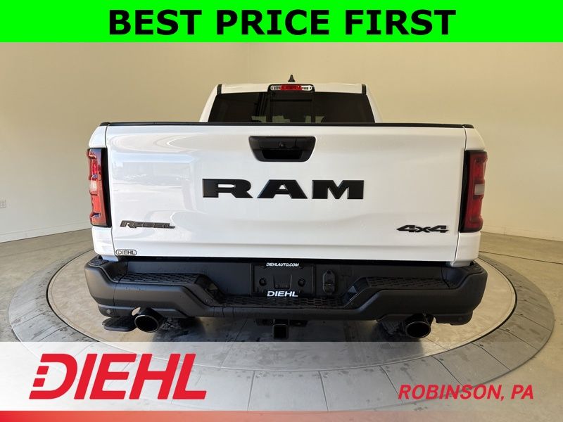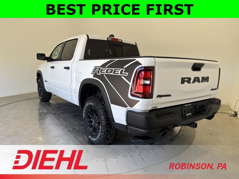 2026 Ram 1500 Rebel Crew Cab 4x4 in Bright White with Hurricane twin turbo power, Rebel off road suspension and aggressive black styling.