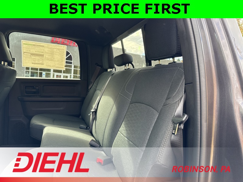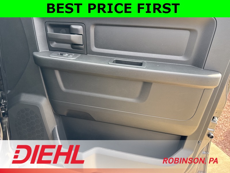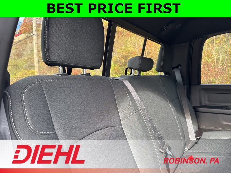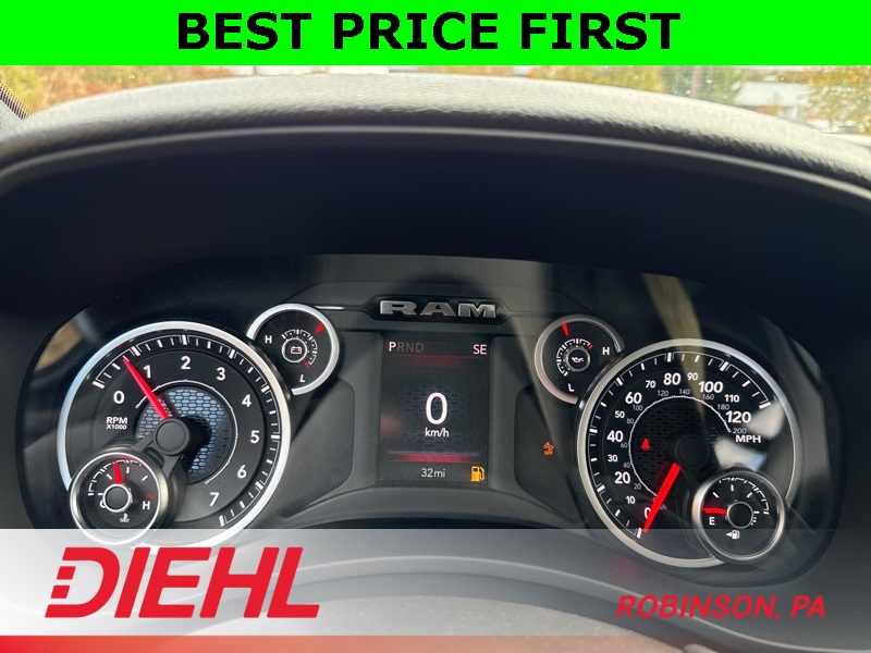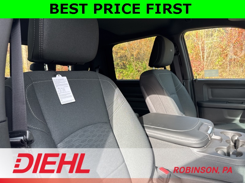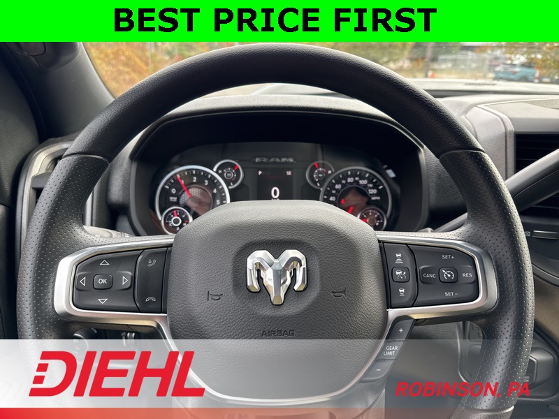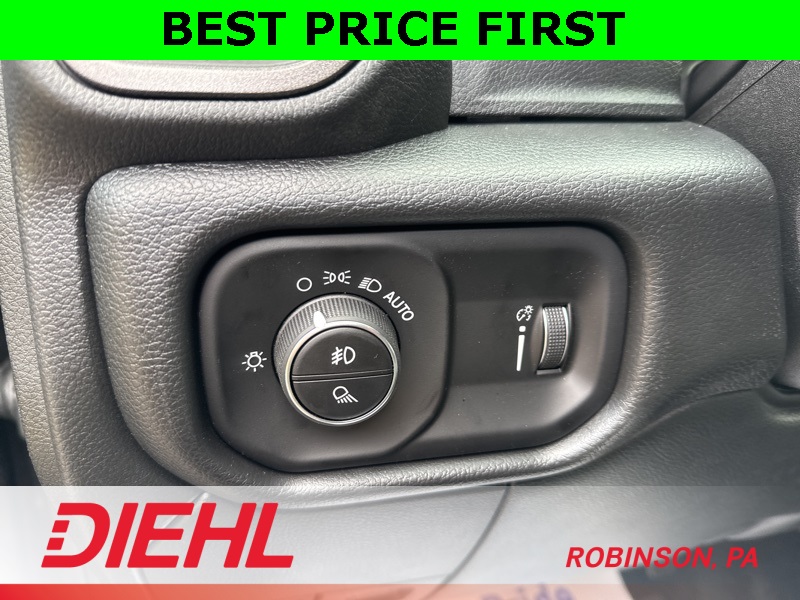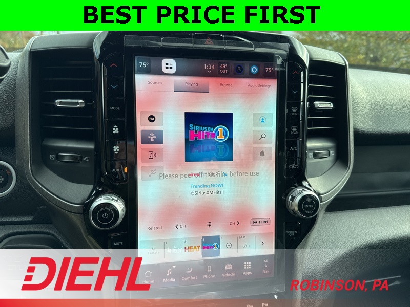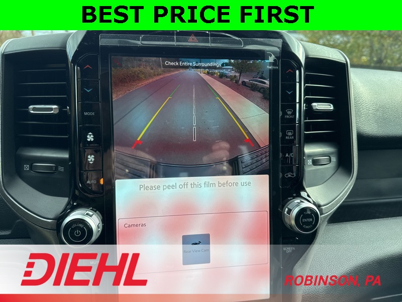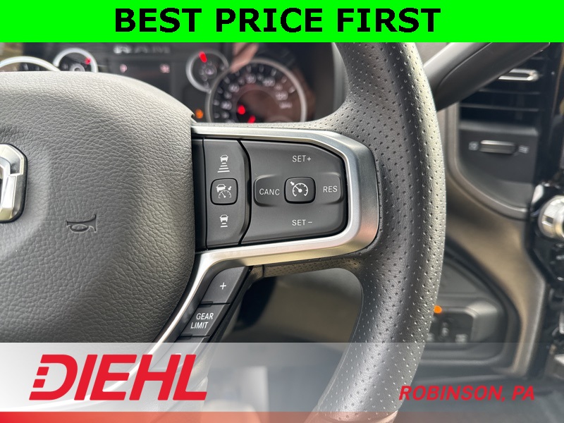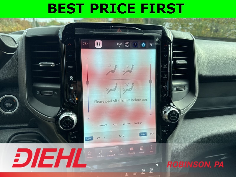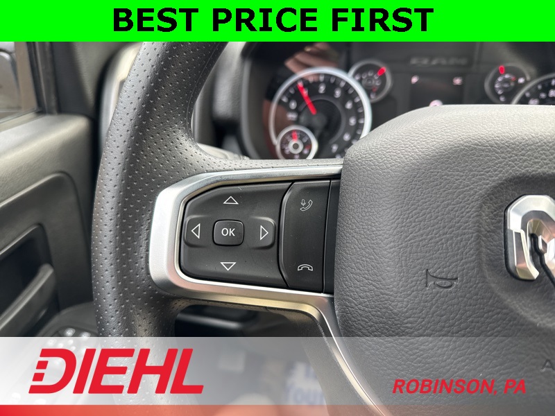 Inside the Crew Cab, comfort meets capability. You get the Uconnect 5 system with the 8.4-inch touchscreen, Apple CarPlay, Android Auto, remote start, power windows, and a leather-wrapped wheel. The convenience features you need are all here—multiple charge ports, push-button start, satellite radio, and smart storage all around the cabin.