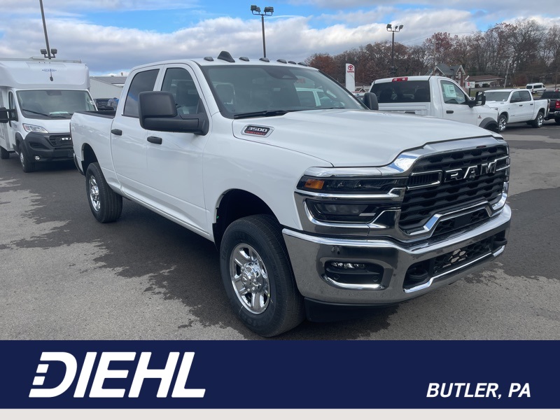 Bed Utility Group (LED Bed Lighting, MOPAR Deployable Bed Step, and MOPAR Spray in Bedliner), Chrome Appearance Group A (115-Volt Auxiliary Front Power Outlet, 400W Inverter, Bright Front Bumper, Bright Rear Bumper, Center Hub, Chrome Grille Surround, Exterior 115V AC Outlet, Matte Black Mesh with Chrome Grille, and Wheels: 18" x 8.0" Steel Chrome Clad), Commercial Features Package (ParkSense Front/Rear Park Assist System), Quick Order Package 2UA Tradesman, 2 Way Rear Headrest Seat, 4 Way Front Headrests, 4-Wheel Disc Brakes, 40/20/40 Split Bench Seat, 4G LTE Wi-Fi Hot Spot, 6 Speakers, ABS brakes, Air Conditioning, AM/FM radio: SiriusXM, Apple CarPlay, Apple CarPlay/Android Auto, Black Exterior Mirrors, Brake assist, Clearance Lamps, Compass, Connectivity - US/Canada, Dash Pass Thru Wire Circuits, Delay-off headlights, Driver door bin, Dual front impact airbags, Dual front side impact airbags, Electronic Stability Control, Front anti-roll bar, Front Armrest with Cupholders, Front Center Armrest w/Storage, Front fog lights, Front License Plate Bracket, Front reading lights, Fully automatic headlights, Global Telematics Box Module, Google Android Auto, GPS Antenna Input, Illuminated entry, Instrument Panel Mounted Auxiliary Switches, Integrated Voice Command with Bluetooth, Low tire pressure warning, Manual Adjust 4-Way Driver Seat, Manual Adjust 4-Way Front Passenger Seat, Manual Folding Exterior Mirrors, Manuarl Telescoping Mirrors, MOPAR Front and Rear Rubber Floor Mats, Occupant sensing airbag, Outside temperature display, Overhead airbag, Overhead console, Panic alarm, ParkView Rear Back-Up Camera, Passenger door bin, Passenger vanity mirror, Power steering, Power windows, Radio data system, Radio: Uconnect 5 with 8.4" Display, Rear Folding Seat, Rear step bumper, Rear Wheelhouse Liners, Rear window defroster, Remote keyless entry, Remote USB Port - Charge Only, Selectable Tire Fill Alert, SiriusXM Radio Service, Speed control, Storage Tray, Tachometer, Tilt steering wheel, Traction control, Variably intermittent wipers, Voltmeter, and Wheels: 18" x 8.0" Black Painted Steel. Bright White Clearcoat 2026 Ram 3500 Tradesman 4WD 8-Speed Automatic 6.4L V8