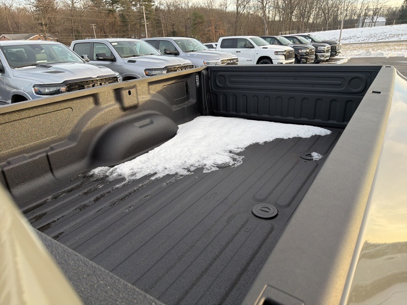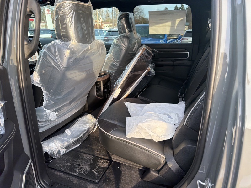 The Laramie Level 1 Plus Equipment Group elevates the interior with leather trimmed bucket seats, heated and ventilated front seats, heated steering wheel, power adjustable pedals with memory, and power 8-way front seats with lumbar adjustment. Smart storage is built in with folding flat load floor storage, second-row in-floor bins, a full length upgraded floor console, rear 60/40 folding seat, and MOPAR front and rear rubber floor mats. LED bed lighting, MOPAR spray-in bedliner, and remote tailgate release make the cargo area easier to use.