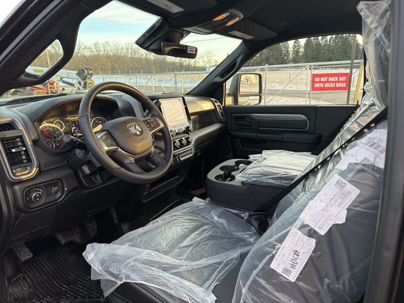 Chrome Appearance Group (19.5" x 6.0" Steel Wheels, Bright Front Bumper, Center Hub, Chrome Grille Surround, and Matte Black Mesh with Chrome Grille), Cold Weather Group (Engine Block Heater and MOPAR Winter Front Grille Cover), Heavy Duty Snow Plow Prep Group (Heavy Duty Front Suspension Group and Upgraded Rear HD Stabilizer Bar), Max Tow Package (Trailer Brake Control and Trailer Light Check), Quick Order Package 25A Tradesman, Tradesman Level 1 Equipment Group (Black Exterior Mirrors, Black Power Heated Fold Telescope Mirrors, Exterior Mirrors Courtesy Lamps, Exterior Mirrors with Heating Element, Exterior Mirrors with Supplemental Signals, Front 1-Touch Down Power Windows, Manual Folding Exterior Mirrors, Manuarl Telescoping Mirrors, Mirror Running Lights, Power Adjust Mirrors, Power-Adjustable Convex Aux Mirrors, Rear Window Defroster, Remote Keyless Entry, Speed Sensitive Power Locks, and Upgraded Door Trim Panel), 4 Speakers, 4-Wheel Disc Brakes, 4.44 Axle Ratio, 40/20/40 Split Bench Seat, 4G LTE Wi-Fi Hot Spot, ABS brakes, Air Conditioning, AM/FM radio: SiriusXM, Apple CarPlay, Apple CarPlay/Android Auto, Cargo and CHMSL Lamp, Compass, Connectivity - US/Canada, Delay-off headlights, Driver door bin, Dual front impact airbags, Dual rear wheels, Electronic Stability Control, Emergency communication system: RAM Connect, For Details, Visit DriveUconnect.com, Front anti-roll bar, Front Armrest with Cupholders, Front Center Armrest w/Storage, Front fog lights, Front License Plate Bracket, Front reading lights, Fully automatic headlights, Global Telematics Box Module, Google Android Auto, GPS Antenna Input, Integrated Voice Command with Bluetooth, Manual Adjust 4-Way Driver Seat, Manual Adjust 4-Way Front Passenger Seat, Occupant sensing airbag, Outside temperature display, Overhead console, ParkSense Front/Rear Park Assist System, ParkView Rear Back-Up Camera, Passenger door bin, Passenger vanity mirror, Power steering, Power Take-Off Right/Left, Radio data system, Radio: Uconnect 5 with 8.4" Display, Rear anti-roll bar, Remote USB Port - Charge Only, Speed control, Tachometer, Temperature and Compass Gauge, Tilt steering wheel, Traction control, Variably intermittent wipers, Voltmeter, Wheels: 19.5" x 6.0" Black Painted Steel, and Wheels: 19.5" x 6.0" Forged Aluminum PolisheD. Diamond Black Crystal Pearlcoat 2026 Ram 5500HD Tradesman commercial 4WD 8-Speed Automatic Cummins 6.7L I6 Turbodiesel