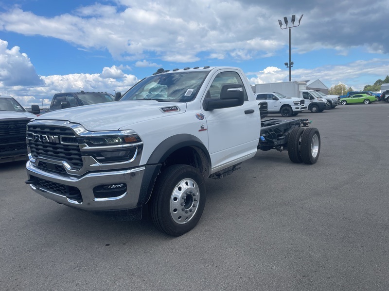 Chrome Appearance Group (19.5" x 6.0" Steel Wheels, Bright Front Bumper, Center Hub, Chrome Grille Surround, and Matte Black Mesh with Chrome Grille), Cold Weather Group (Engine Block Heater and MOPAR Winter Front Grille Cover), Heavy Duty Snow Plow Prep Group (Heavy Duty Front Suspension Group and Upgraded Rear HD Stabilizer Bar), Max Tow Package (Trailer Brake Control and Trailer Light Check), Quick Order Package 25A Tradesman, Tradesman Level 1 Equipment Group (Black Exterior Mirrors, Black Power Heated Fold Telescope Mirrors, Exterior Mirrors Courtesy Lamps, Exterior Mirrors with Heating Element, Exterior Mirrors with Supplemental Signals, Front 1-Touch Down Power Windows, Manual Folding Exterior Mirrors, Manuarl Telescoping Mirrors, Mirror Running Lights, Power Adjust Mirrors, Power-Adjustable Convex Aux Mirrors, Rear Window Defroster, Remote Keyless Entry, Speed Sensitive Power Locks, and Upgraded Door Trim Panel), 4 Speakers, 4-Wheel Disc Brakes, 4.44 Axle Ratio, 40/20/40 Split Bench Seat, 4G LTE Wi-Fi Hot Spot, ABS brakes, Air Conditioning, AM/FM radio: SiriusXM, Apple CarPlay, Apple CarPlay/Android Auto, Cargo and CHMSL Lamp, Compass, Connectivity - US/Canada, Delay-off headlights, Driver door bin, Dual front impact airbags, Dual rear wheels, Electronic Stability Control, Emergency communication system: RAM Connect, For Details, Visit DriveUconnect.com, Front anti-roll bar, Front Armrest with Cupholders, Front Center Armrest w/Storage, Front fog lights, Front License Plate Bracket, Front reading lights, Fully automatic headlights, Global Telematics Box Module, Google Android Auto, GPS Antenna Input, Integrated Voice Command with Bluetooth, Manual Adjust 4-Way Driver Seat, Manual Adjust 4-Way Front Passenger Seat, Occupant sensing airbag, Outside temperature display, Overhead console, ParkView Rear Back-Up Camera, Passenger door bin, Passenger vanity mirror, Power steering, Power Take-Off Right/Left, Radio data system, Radio: Uconnect 5 with 8.4" Display, Rear anti-roll bar, Remote USB Port - Charge Only, Speed control, Tachometer, Temperature and Compass Gauge, Tilt steering wheel, Traction control, Variably intermittent wipers, Voltmeter, Wheels: 19.5" x 6.0" Black Painted Steel, and Wheels: 19.5" x 6.0" Forged Aluminum PolisheD. Bright White Clearcoat 2026 Ram 5500HD Tradesman Commercial 4WD 8-Speed Automatic Cummins 6.7L I6 Turbodiesel