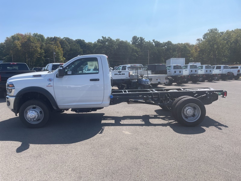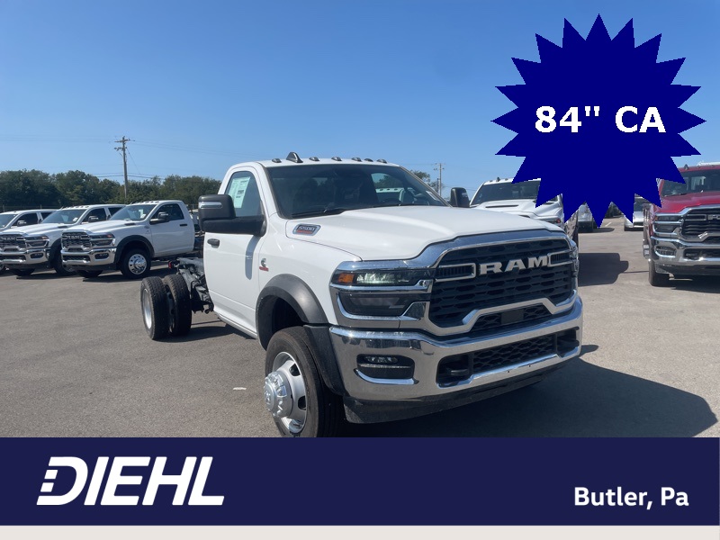 Chrome Appearance Group (19.5" x 6.0" Steel Wheels, Bright Front Bumper, Center Hub, Chrome Grille Surround, and Matte Black Mesh with Chrome Grille), Cold Weather Group (Engine Block Heater and MOPAR Winter Front Grille Cover), Heavy Duty Snow Plow Prep Group (Heavy Duty Front Suspension Group and Upgraded Rear HD Stabilizer Bar), Max Tow Package (Trailer Brake Control and Trailer Light Check), Quick Order Package 25A Tradesman, Tradesman Level 1 Equipment Group (Black Exterior Mirrors, Black Power Heated Fold Telescope Mirrors, Exterior Mirrors Courtesy Lamps, Exterior Mirrors with Heating Element, Exterior Mirrors with Supplemental Signals, Front 1-Touch Down Power Windows, Manual Folding Exterior Mirrors, Manuarl Telescoping Mirrors, Mirror Running Lights, Power Adjust Mirrors, Power-Adjustable Convex Aux Mirrors, Rear Window Defroster, Remote Keyless Entry, Speed Sensitive Power Locks, and Upgraded Door Trim Panel), 4 Speakers, 4-Wheel Disc Brakes, 4.44 Axle Ratio, 40/20/40 Split Bench Seat, 4G LTE Wi-Fi Hot Spot, ABS brakes, Air Conditioning, AM/FM radio: SiriusXM, Apple CarPlay, Apple CarPlay/Android Auto, Cargo and CHMSL Lamp, Compass, Connectivity - US/Canada, Delay-off headlights, Driver door bin, Dual front impact airbags, Dual rear wheels, Electronic Stability Control, Emergency communication system: RAM Connect, For Details, Visit DriveUconnect.com, Front anti-roll bar, Front Armrest with Cupholders, Front Center Armrest w/Storage, Front fog lights, Front License Plate Bracket, Front reading lights, Fully automatic headlights, Global Telematics Box Module, Google Android Auto, GPS Antenna Input, Integrated Voice Command with Bluetooth, Manual Adjust 4-Way Driver Seat, Manual Adjust 4-Way Front Passenger Seat, Occupant sensing airbag, Outside temperature display, Overhead console, ParkView Rear Back-Up Camera, Passenger door bin, Passenger vanity mirror, Power steering, Power Take-Off Right/Left, Radio data system, Radio: Uconnect 5 with 8.4" Display, Rear anti-roll bar, Remote USB Port - Charge Only, Speed control, Tachometer, Temperature and Compass Gauge, Tilt steering wheel, Traction control, Variably intermittent wipers, Voltmeter, and Wheels: 19.5" x 6.0" Black Painted SteeL. Bright White Clearcoat 2026 Ram 5500HD Tradesman Commercial 4WD 8-Speed Automatic Cummins 6.7L I6 Turbodiesel