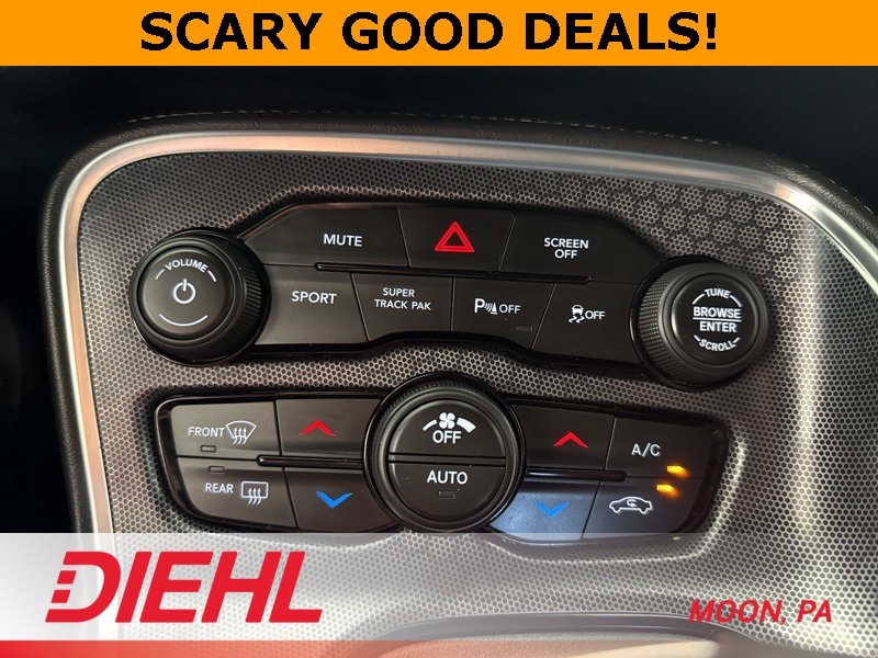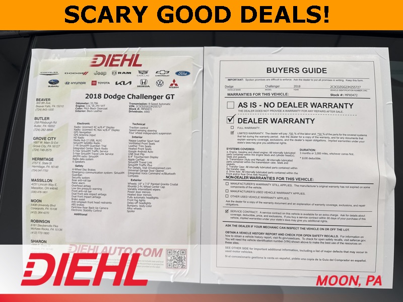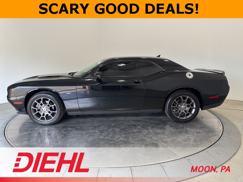 If you've been waiting for a car that makes you feel like a rock star without demanding a rock star paycheck, this 2018 Dodge Challenger GT is ready to take center stage. Painted in Pitch Black Clearcoat with a sleek black interior, it delivers muscle car swagger wrapped in modern all-wheel drive confidence. Under the hood sits a 3.6L V6 paired to an 8-speed automatic transmission, giving you smooth shifts, plenty of punch, and year-round traction that laughs at bad weather.The aggressive stance is set off by aluminum wheels, LED brake lights, a rear spoiler, and those unmistakable Challenger lines that turn every grocery run into a car show. Step inside and you'll find leather-trimmed bucket seats, heated and cooled front seats, a heated steering wheel, and an 8.4-inch touchscreen with navigation, Apple CarPlay, Android Auto, and premium sound that makes every playlist feel like a live concert. Convenience is dialed in with remote keyless entry, push-button start, dual-zone climate control, and a universal garage door opener, because this car doesn't just look good, it makes your life easier too.Safety and security come standard with backup camera, rear parking aid, traction control, stability control, and a full suite of airbags. With only 33,706 miles on the odometer, this Challenger is barely broken in and ready for many more miles of thrill rides and late-night cruises.This isn't just another used car...its your ticket to muscle car heritage with modern comfort baked right in. Don't let this one sit on the lot and haunt your dreams... swing by Diehl of Moon today, take it for a spin, and claim your piece of American performance before someone else beats you to it.