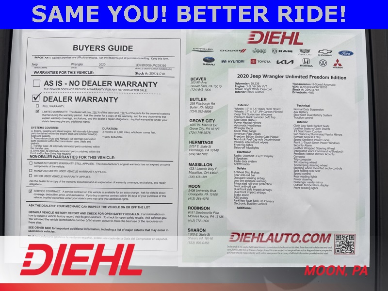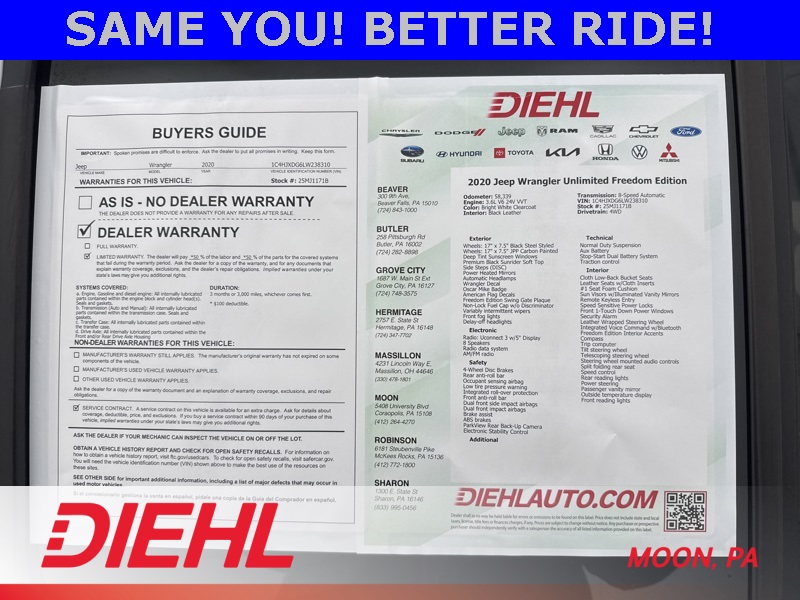 Diehl Automotive utilizes a system that generates market value pricing automatically for new and pre-owned vehicles and may cause errors, inaccuracies, or omissions. Some aftermarket additions or accessories may not be displayed properly. For accuracy, please contact the dealer for real-time, accurate pricing. A documentation fee of $490 applies and is not included in the pricing. Tax, title, and tags are also not included and must be paid by the purchaser. Some prices may include manufacturer-to-dealer offers that are not compatible with manufacturer special finance programs and/or lease offers. While great effort is made to ensure the accuracy of the information on this site, errors do occur, so please verify information with a customer service representative. This is easily done by calling us or by visiting us at the dealership.