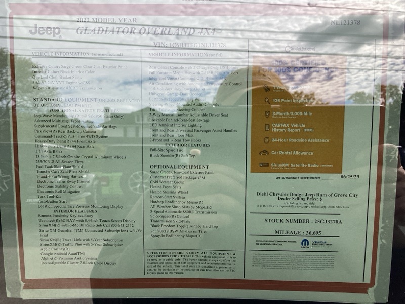 Sarge Green Clearcoat 2022 Jeep Gladiator Overland 4D Crew Cab 4WD 3.6L V6 24V VVT 8-Speed Automatic