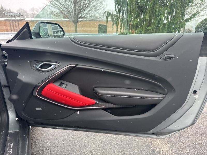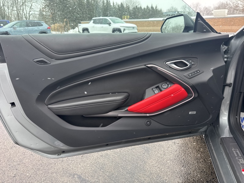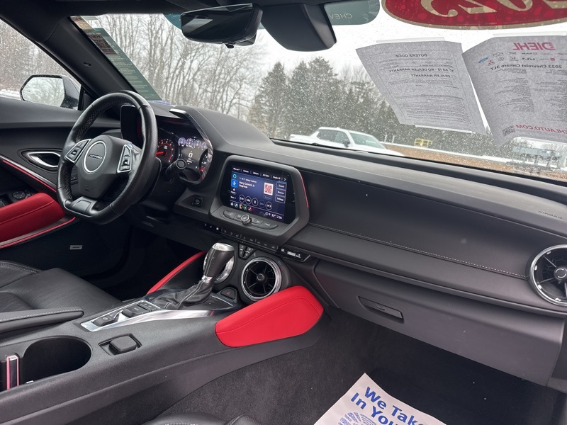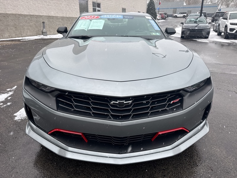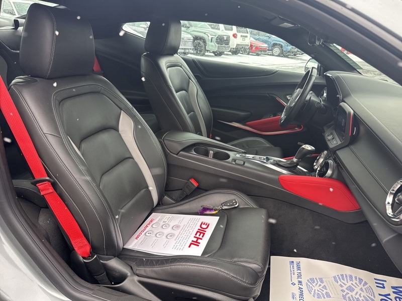 Sharkskin Metallic 2023 Chevrolet Camaro 3LT 2D Coupe RWD 3.6L V6 DI 10-Speed Automatic Preferred Equipment Group 3LT (Rear Park Assist), Redline Edition (Black Camaro Emblem Fender Badge w/Red Outline, Lower Grille w/Red Hot Inserts, Red Knee Pads, Red Seat Belt Color, Redline Edition Graphics, and Wheels: 20" Black-Painted Aluminum w/Red Accents), RS Package (Dark Tint LED Tail Lamps), Satin Black Appearance Package (Decklid-Mounted Lip Spoiler), Camaro 3LT, Chevrolet Certified Pre-Owned Certified, Sharkskin Metallic, Jet Black Leather, 4-Wheel Disc Brakes, 6-Way Power Front Passenger Seat Adjuster, 8-Way Power Driver Seat Adjuster, ABS brakes, Apple CarPlay/Android Auto, Automatic temperature control, Bluetooth® For Phone, Bose Premium 9-Speaker Audio System Feature, Delay-off headlights, Front dual zone A/C, Fully automatic headlights, Heads-Up Display, Low tire pressure warning, Memory seat, Power driver seat, Remote Vehicle Starter System, Steering wheel mounted audio controls, Telescoping steering wheel, Tilt steering wheel, 18" Silver-Painted Aluminum Wheels, 2.77 Rear Axle Ratio, 9 Speakers, Air Conditioning, Alloy wheels, AM/FM radio: SiriusXM with 360L, Auto-dimming door mirrors, Black Fuel Filler Door w/Gloss Black Insert (LPO), Brake assist, Bumpers: body-color, Compass, Driver door bin, Driver vanity mirror, Dual front impact airbags, Dual front side impact airbags, Dual Mode Exhaust, Electronic Stability Control, Exterior Parking Camera Rear, Four wheel independent suspension, Front anti-roll bar, Front Bucket Seats, Front Center Armrest, Front reading lights, Front Sport Bucket Seats, Heated door mirrors, Heated Driver & Front Passenger Seats, Heated front seats, Heated steering wheel, Illuminated entry, Knee airbag, Leather Shift Knob, Leather-Trimmed Seat Trim, Occupant sensing airbag, Outside temperature display, Overhead airbag, Paddle-Shift Manual Controls, Panic alarm, Passenger door bin, Passenger vanity mirror, Power door mirrors, Power passenger seat, Power steering, Power windows, Premium audio system: Chevrolet Infotainment System, Radio data system, Radio: Chevrolet Infotainment 3 Plus System, Radio: Chevrolet Infotainme