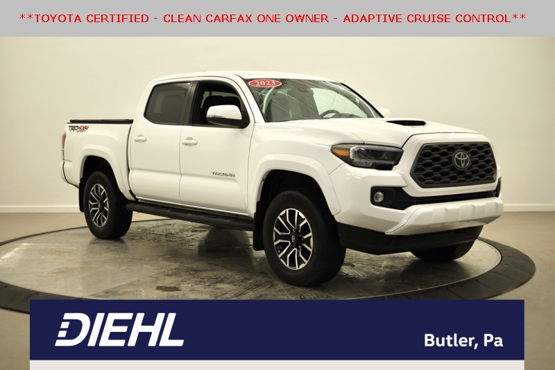 **TOYOTA CERTIFIED**, **HARD FACTORY TONNEAU COVER**, **FACTORY RUNNING BOARDS**, **LED HEADLIGHTS**, **POWER DRIVER SEAT**, **ADAPTIVE CRUISE CONTROL**, **LANE KEEP ASSIST**, **AUTO HIGH BEAMS**, **CLEAN CARFAX ONE OWNER**, 4WD, 120V/400W Deck Mounted AC Power, 17" Machined Alloy Wheels, 5" Black Oval Tube Steps (TMS), 6 Speakers, ABS brakes, Active Cruise Control, Air Conditioning, Alloy wheels, AM/FM radio: SiriusXM, Anti-whiplash front head restraints, Apple CarPlay/Android Auto, Auto High-beam Headlights, Auto-dimming Rear-View mirror, Auto-Dimming Rearview Mirror w/HomeLink, Automatic temperature control, Axle Ratio: 3.91, Brake assist, Bumpers: body-color, Color-Keyed Overfenders, Driver door bin, Dual front impact airbags, Dual front side impact airbags, Electronic Stability Control, Emergency communication system: Safety Connect (1-year trial), Engine Immobilizer, Exterior Parking Camera Rear, Fabric Seat Trim, Front anti-roll bar, Front Bucket Seats, Front Center Armrest, Front Door Smart Key System w/Push Button Start, Front dual zone A/C, Front fog lights, Front reading lights, Front Seats, Front wheel independent suspension, Garage door transmitter: HomeLink, Heated door mirrors, Illuminated entry, Knee airbag, Leather Shift Knob, Low tire pressure warning, Occupant sensing airbag, Outside temperature display, Overhead airbag, Overhead console, Panic alarm, Passenger door bin, Power door mirrors, Power driver seat, Power Sliding Rear Window w/Privacy Glass, Power steering, Power windows, Radio: Audio, Rear step bumper, Remote keyless entry, Security system, Speed control, Speed-sensing steering, Split folding rear seat, Steering wheel mounted audio controls, Tachometer, Telescoping steering wheel, Tilt steering wheel, Traction control, TRD Sport Package, Trip computer, Turn signal indicator mirrors, Variably intermittent wipers. CARFAX One-Owner. Clean CARFAX. Ice Cap 2023 Toyota Tacoma TRD Sport V6 4WD 6-Speed Automatic 3.5L V6 PDI DOHC 24V LEV3-ULEV70 278hp